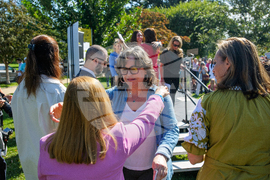 Jess Michaels, center, reaches out to Liz Stein, left, at a Stand with Survivors Rally on Capitol Hill, Wednesday, Sept. 3, 2025, in Washington. (AP Photo/Rod Lamkey, Jr.)