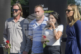 Brothers of Virginia Giuffre, Daniel Wilson, left, and Sky Roberts, center, are joined by Amanda Roberts, second from right, and Sigrid McCawley, during a Stand with Survivors Rally on Capitol Hill, Wednesday, Sept. 3, 2025, in Washington. (AP Photo/Rod Lamkey, Jr.)
