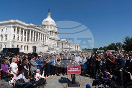 Demonstrators hold banners during a news conference at the U.S. Capitol, Wednesday, Sept. 3, 2025, in Washington. (AP Photo/Jose Luis Magana)