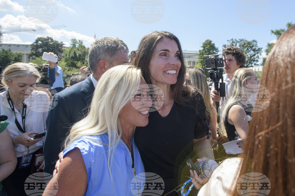 From left, Anouska de Georgiou, Chauntae Davies, Jena-Lisa Jones, rear center, and Courtney Wild, right, walk after speaking at a news conference at the U.S. Capitol, Wednesday, Sept. 3, 2025, in Washington. (AP Photo/Jose Luis Magana)