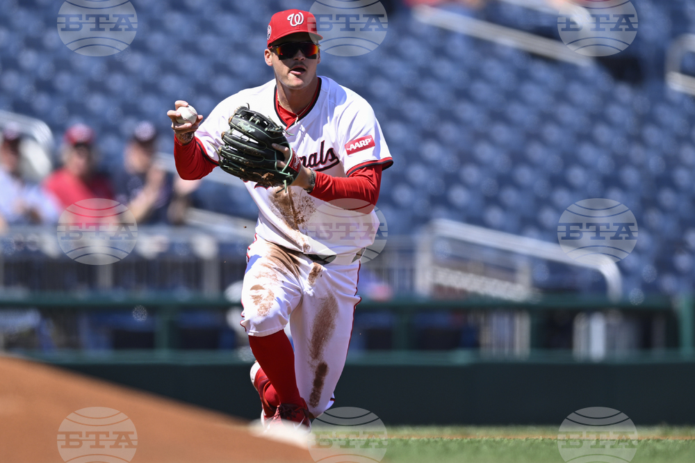 Washington Nationals third baseman Brady House sets up throw out Miami Marlins' Xavier Edwards during the first inning of a baseball game, Wednesday, Sept. 3, 2025, in Washington. (AP Photo/John McDonnell)