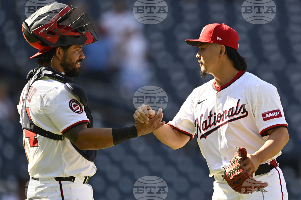 Washington Nationals catcher Jorge Alfaro, left, congratulates relief pitcher Shinnosuke Ogasawara following a baseball game against the Miami Marlins, Wednesday, Sept. 3, 2025, in Washington. (AP Photo/John McDonnell)
