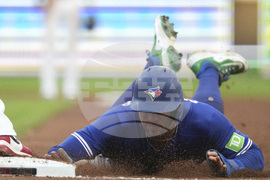 Cincinnati Reds' Matt McLain, background, reaches first base safely before Toronto Blue Jays' Vladimir Guerrero Jr., left, receives the throw in the fifth inning of a baseball game Tuesday, Sept. 2, 2025, in Cincinnati. (AP Photo/Kareem Elgazzar)