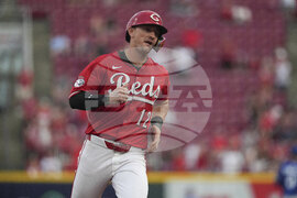 Cincinnati Reds' Matt McLain follows through after hitting an infield single in the fifth inning of a baseball game against the Toronto Blue Jays, Tuesday, Sept. 2, 2025, in Cincinnati. (AP Photo/Kareem Elgazzar)