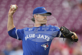 Toronto Blue Jays' José Berríos delivers a pitch in the first inning of a baseball game against the Cincinnati Reds, Tuesday, Sept. 2, 2025, in Cincinnati. (AP Photo/Kareem Elgazzar)