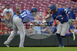 Toronto Blue Jays' Bo Bichette, far right, is congratulated by George Springer, center, and Vladimir Guerrero Jr. (27) after hitting a three-run home run in the second inning of a baseball game against the Cincinnati Reds, Tuesday, Sept. 2, 2025, in Cincinnati. (AP Photo/Kareem Elgazzar)