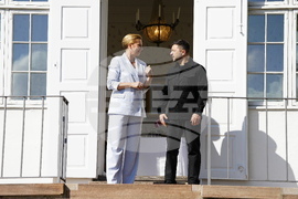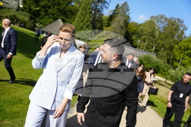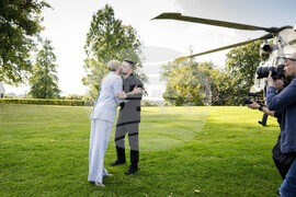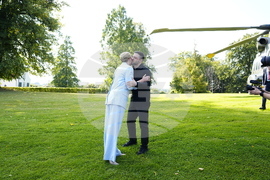Danish Prime Minister Mette Frederiksen, left, welcomes Ukraine's President Volodymyr Zelenskyy, on the lawn in front of Marienborg, in Copenhagen, Wednesday, Sept. 3, 2025. (Mads Claus Rasmussen/Ritzau Scanpix via AP)