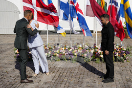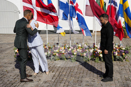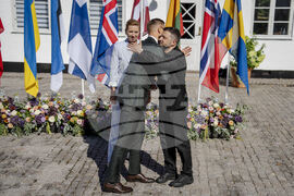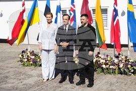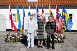 Danish Prime Minister Mette Frederiksen, centre, welcomes heads of state and government from the Nordic and Baltic countries, next to Ukraine's President Volodymyr Zelenskyy, right, as they participate in a summit on Ukraine at Marienborg, in Copenhagen, Wednesday, Sept. 3, 2025. (Mads Claus Rasmussen/Ritzau Scanpix via AP)