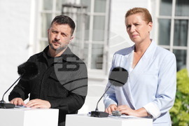 Denmark's Prime Minister Mette Frederiksen and Ukraine's President, Volodymyr Zelenskyy during a statement at Marienborg, Copenhagen, Denmark, Wednesday, Sept. 3, 2025. (Liselotte Sabroe/Ritzau Scanpix via AP)