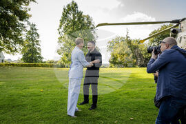 Danish Prime Minister Mette Frederiksen, leftr, welcomes Ukraine's President Volodymyr Zelenskyy, on the lawn in front of Marienborg, in Copenhagen, Wednesday, Sept. 3, 2025. (Mads Claus Rasmussen/Ritzau Scanpix via AP)