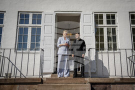Denmark's Prime Minister Mette Frederiksen, left, welcomes Ukraine's President, Volodymyr Zelenskyy, right, at Marienborg, Copenhagen, Denmark, Wednesday, Sept. 3, 2025. (Mads Claus Rasmussen/Ritzau Scanpix via AP)