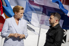 Denmark's Prime Minister Mette Frederiksen, left, and Ukraine's President, Volodymyr Zelenskyy, right, at Marienborg, Copenhagen, Denmark, Wednesday, Sept. 3, 2025. (Mads Claus Rasmussen/Ritzau Scanpix via AP)