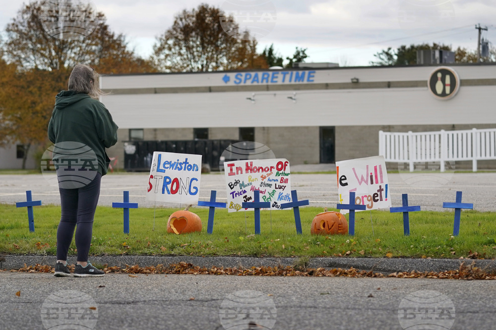 FILE - A woman visits a makeshift memorial outside Sparetime Bowling Alley, the site of a mass shooting, in this Oct. 28, 2023 file photo, in Lewiston, Maine. (AP Photo/Robert F. Bukaty, File)