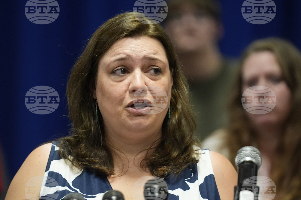 Cynthia Young, who lost a husband and son in the October 2023 mass shooting, speaks at a news conference, Wednesday, Sept. 3, 2025, in Lewiston, Maine. (AP Photo/Robert F. Bukaty)