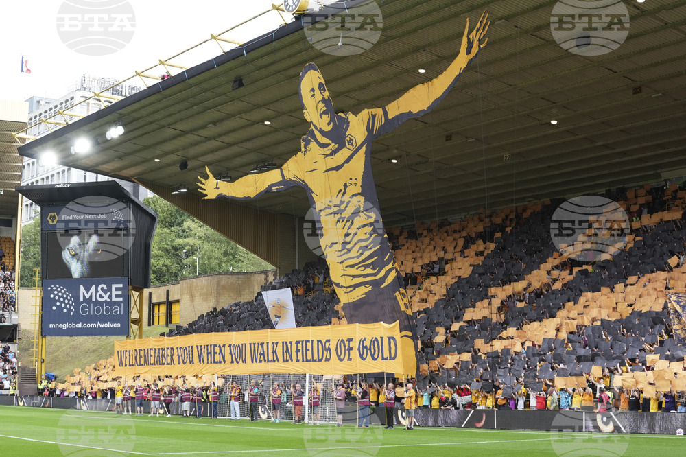FILE - Fans pay a tribute to late Liverpool player Diogo Jota ahead of the English Premier League soccer match between Wolverhampton Wanderers and Manchester City at Molineux Stadium, Wolverhampton, England, Saturday, Aug. 16, 2025. (AP Photo/Dave Shopland, File)