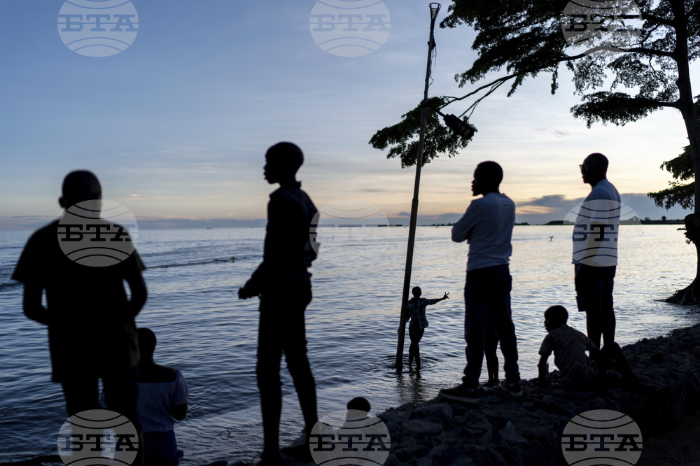 A youth group wades into the waters of Lake Victoria, the world's second-largest freshwater lake, while visiting a beach at sunset, Monday, Nov. 25, 2024, in Entebbe, Uganda. (AP Photo/David Goldman)