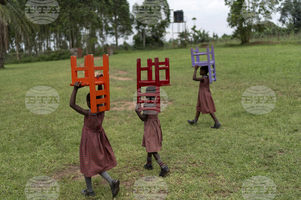 Students carry their chairs at a school for children being raised by their grandparents run by the NGO Reach One Touch One Ministries to help support seniors in the community, in Magogo, Uganda, Saturday, Nov. 16, 2024. (AP Photo/David Goldman)