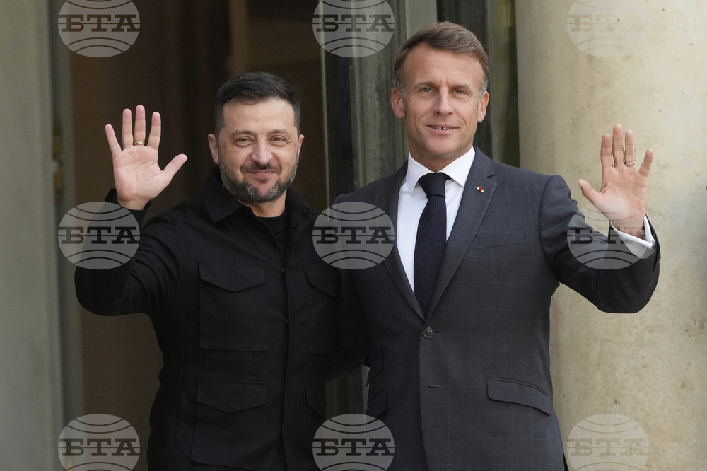 French President Emmanuel Macron, right, and Ukraine's President Volodymyr Zelenskyy wave to journalists prior to a meeting, at the Elysee Palace, in Paris, France, Wednesday, Sept. 3, 2025. (AP Photo/Michel Euler)