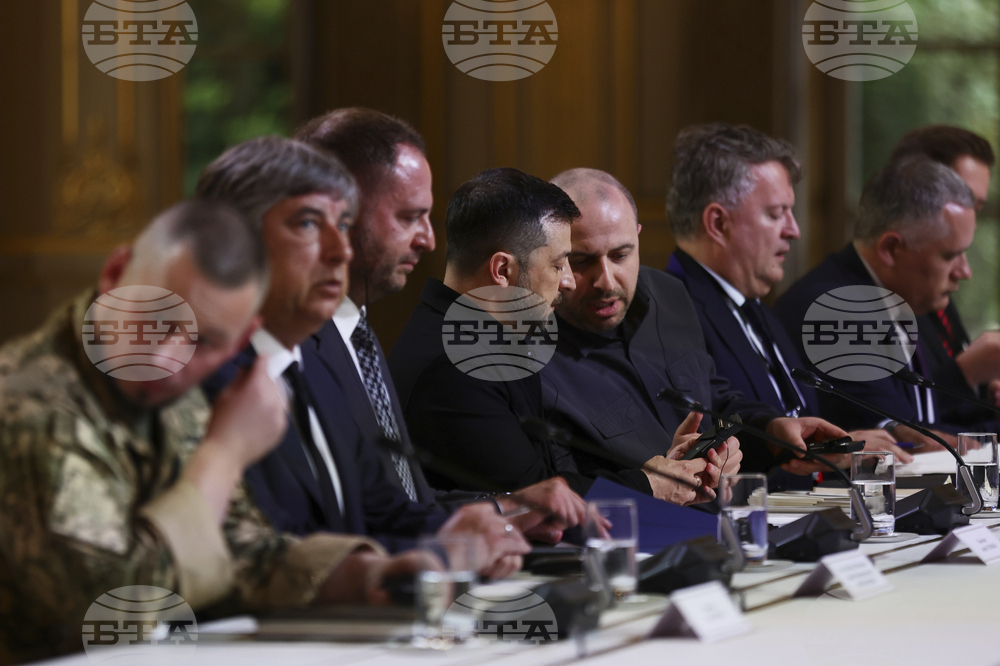 Ukraine's President Volodymyr Zelenskyy, right, and French President Emmanuel Macron, second from right, attend with others international leaders a summit on Ukraine at the Elysee Palace, in Paris, France, Thursday, Sept. 4, 2025. (Ludovic Marin/Pool Photo via AP)