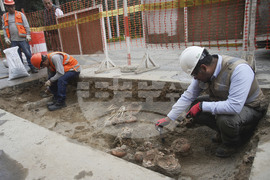 Archaeologists Jose Aliaga excavates artifacts and bones from the pre-Inca Ychsma culture after they were found by city workers digging a natural gas line for the company Calidda in the Santiago de Surco district of Lima, Peru, Wednesday, Sept. 3, 2025. (AP Photo/Guadalupe Pardo)
