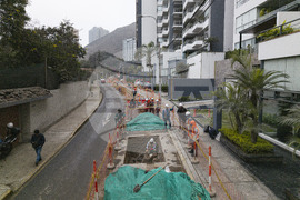 A dog walker passes by archeologists excavating artifacts and bones from the pre-Inca Ychsma culture after they were found by city workers digging a natural gas line for the company Calidda in the Santiago de Surco district of Lima, Peru, Wednesday, Sept. 3, 2025. (AP Photo/Guadalupe Pardo)