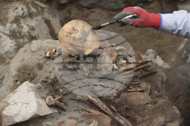 Archaeologist Rodemi Chuquilin excavates artifacts and bones from the pre-Inca Ychsma culture after they were found by city workers digging a natural gas line for the company Calidda in the Santiago de Surco district of Lima, Peru, Wednesday, Sept. 3, 2025. (AP Photo/Guadalupe Pardo)