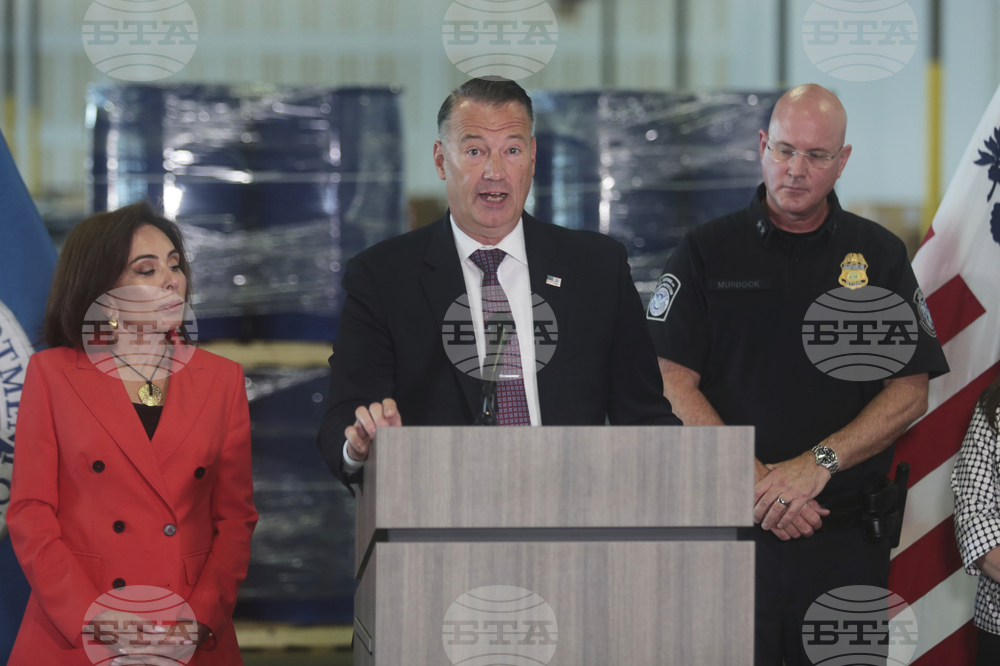U.S. Immigration and Customs Enforcement Acting Director Todd Lyons, center, speaks at a news conference regarding seized chemicals bound for a Mexican drug cartel in Pasadena, Texas, on Wednesday, Sept. 3, 2025. (AP Photo/Lekan Oyekanmi)