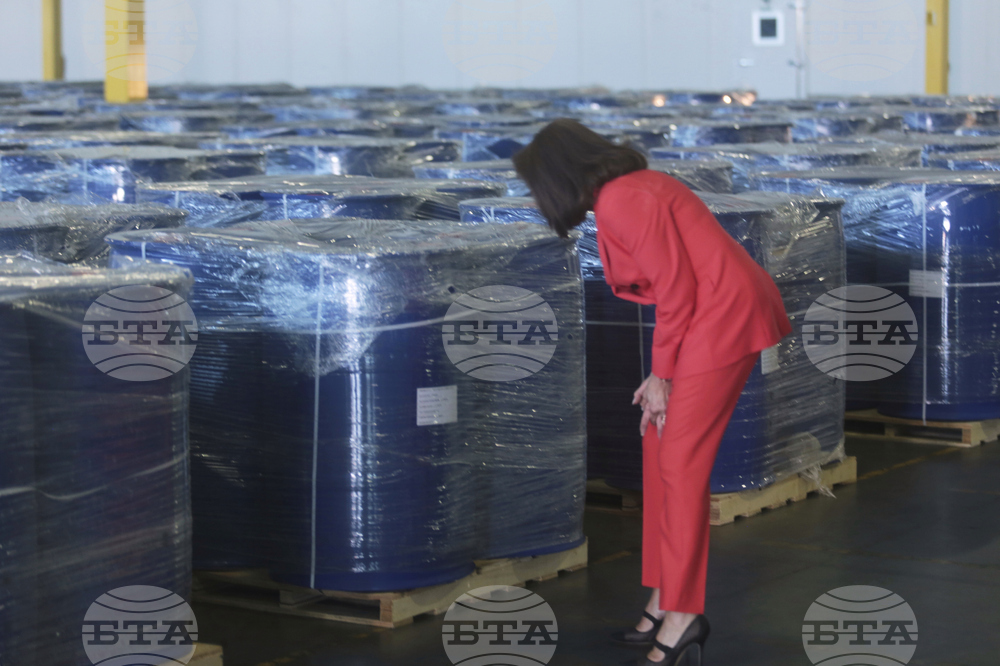 U.S. Attorney for the District of Columbia Jeanine Pirro examines shipping labels on barrels of seized chemicals in Pasadena, Texas, on Wednesday, Sept. 3, 2025. (AP Photo/Lekan Oyekanmi)