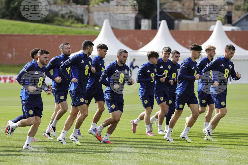 Scotland players run during a training session at Lesser Hampden, Glasgow.Scotland, Thursday Sept. 4, 2025. (Steve Welsh/PA via AP)