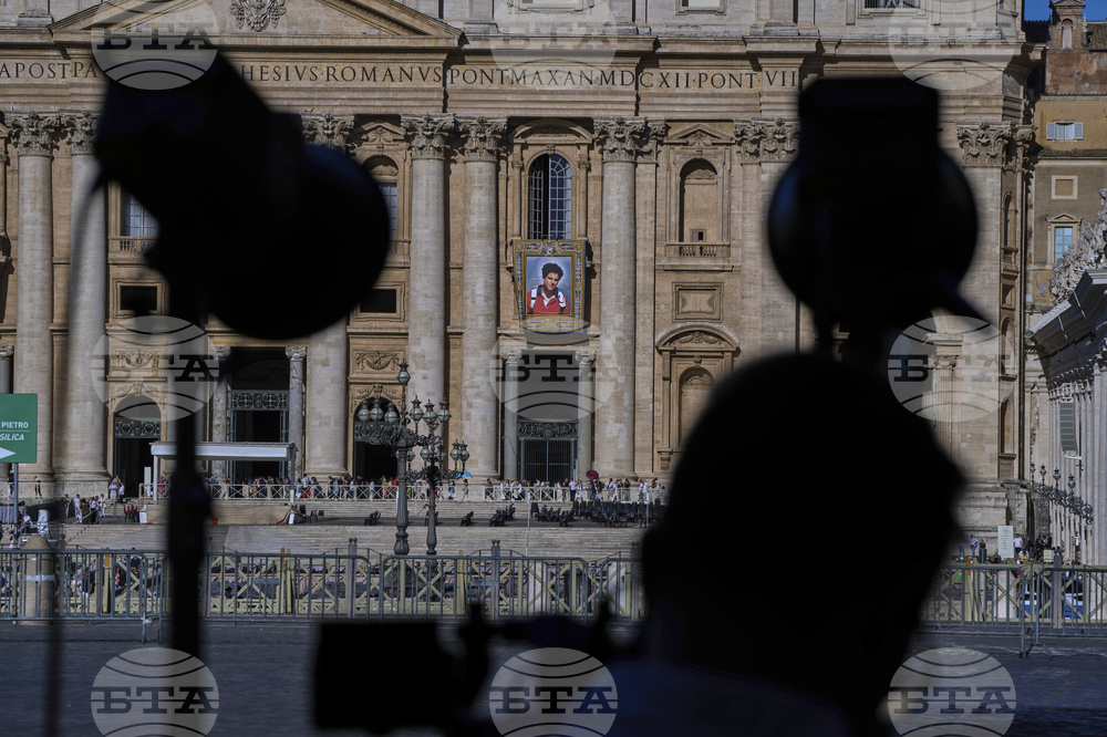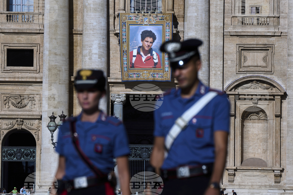 A tapestry with a portrait of Blessed Carlo Acutis, who will be canonized on Sunday, hangs on the facade of St. Peter's Basilica at the Vatican, Thursday, Sept. 4, 2025, as two Carabinieri officers patrol in St. Peter's Square. (AP Photo/Domenico Stinellis)