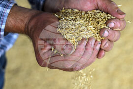 Farmer Arndt Goebel checks the quality of feed barley in Grossschirma, Germany, Thursday, Sept. 4, 2025. (Hendrik Schmidt/dpa via AP)