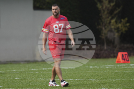 Kansas City Chiefs tight end Travis Kelce, center, and teammates attend a training session prior to a NFL football game against Los Angeles Chargers in Sao Paulo, Brazil, Thursday, Sept. 4, 2025. (AP Photo/Fernando Llano)