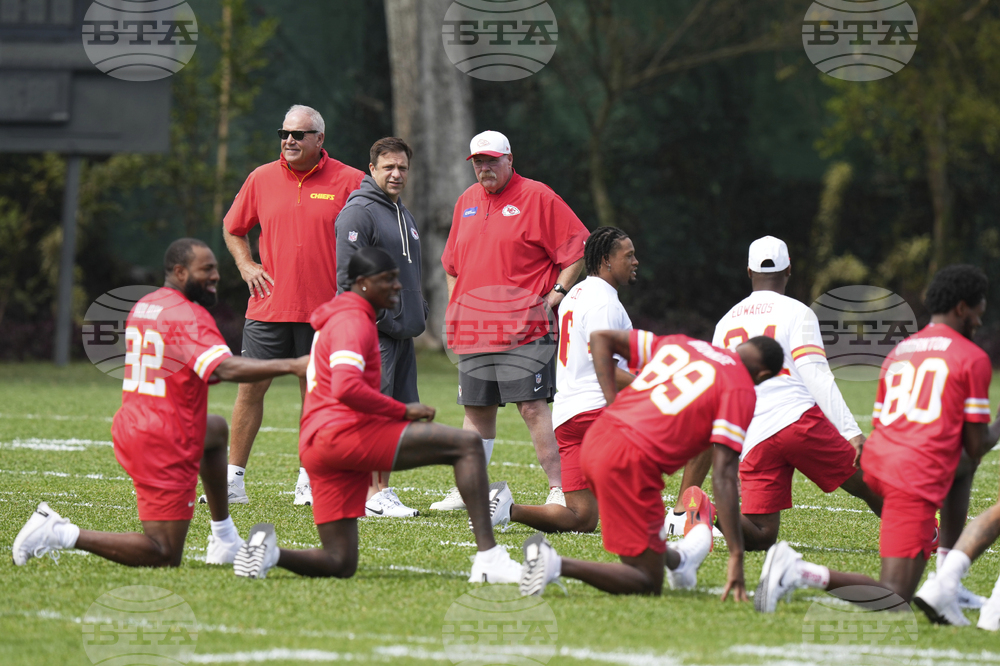 Kansas City Chiefs head coach Andy Reid, standing, third from left, leads a training session prior to a NFL football game against Los Angeles Chargers in Sao Paulo, Brazil, Thursday, Sept. 4, 2025. (AP Photo/Fernando Llano)