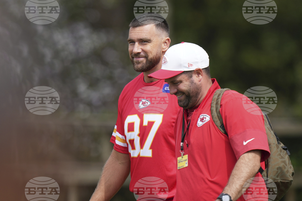 Kansas City Chiefs tight end Travis Kelce, left center, arrives for a training session prior to a NFL football game against Los Angeles Chargers in Sao Paulo, Brazil, Thursday, Sept. 4, 2025. (AP Photo/Fernando Llano)