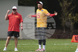 Kansas City Chiefs quarterback Patrick Mahomes, right, holds a ball during a training session prior to a NFL football game against Los Angeles Chargers in Sao Paulo, Brazil, Thursday, Sept. 4, 2025. (AP Photo/Fernando Llano)