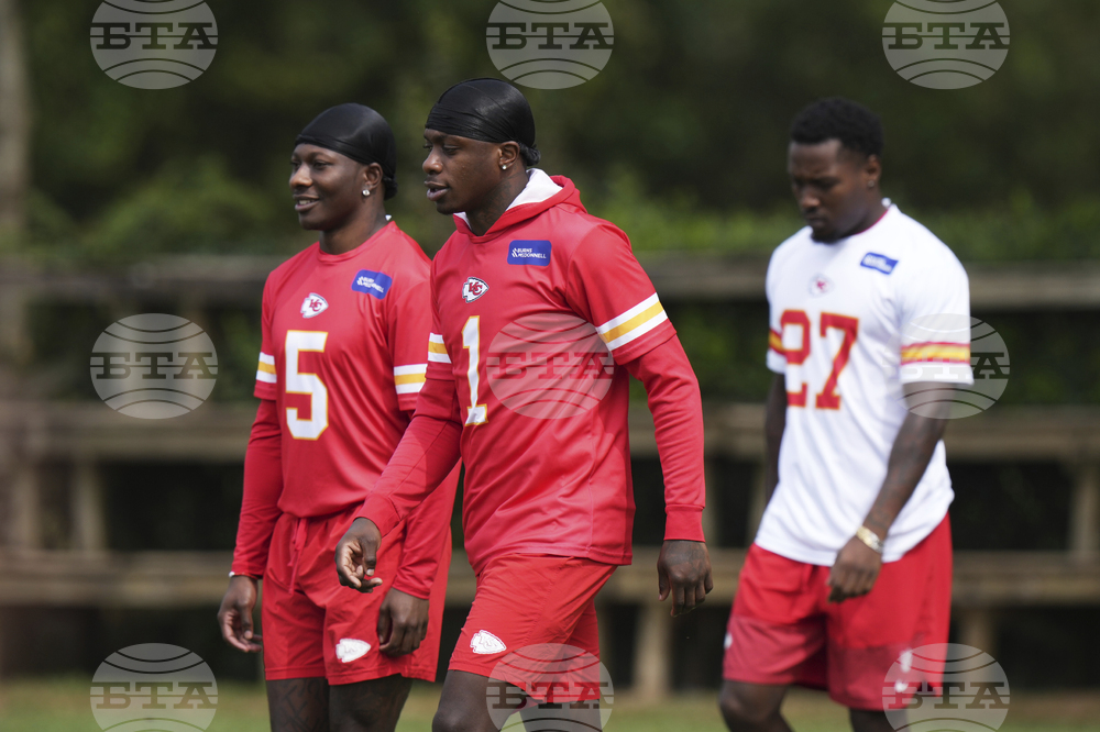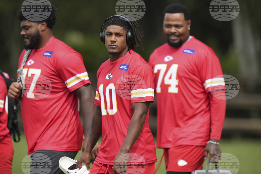 From left, Kansas City Chiefs wide receiver Marquise "Hollywood" Brown, wide receiver Xavier Worthy and safety Chamarri Conner arrive for a training session prior to a NFL football game against Los Angeles Chargers in Sao Paulo, Brazil, Thursday, Sept. 4, 2025. (AP Photo/Fernando Llano)