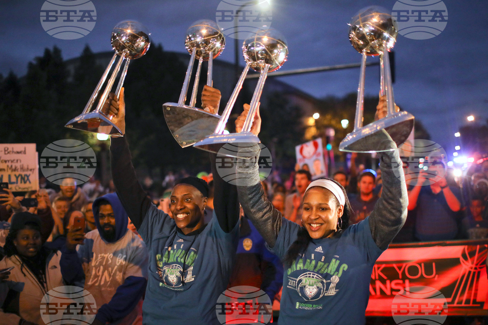 FILE - Minnesota Lynx players Sylvia Fowles, left and Maya Moore held up all four WNBA championship trophies as the team arrives at Williams Arena for a celebration,Thursday night, Oct. 5, 2017, in Minneapolis. (Jeff Wheeler/Star Tribune via AP)