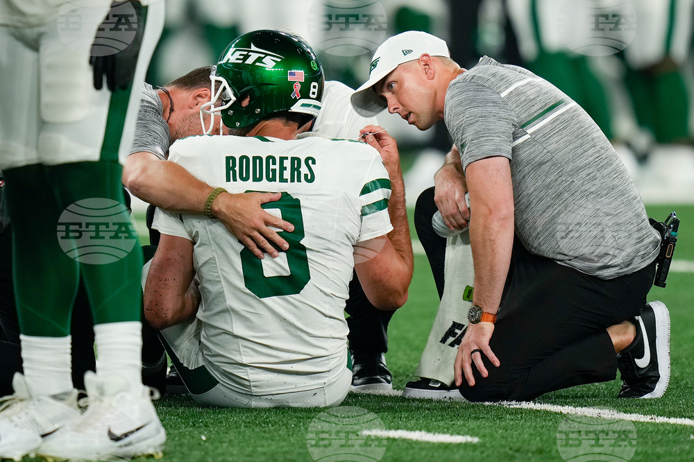 FILE - New York Jets quarterback Aaron Rodgers (8) is tended to on the field during the first quarter of an NFL football game against the Buffalo Bills, Monday, Sept. 11, 2023, in East Rutherford, N.J. (AP Photo/Seth Wenig, File)