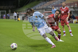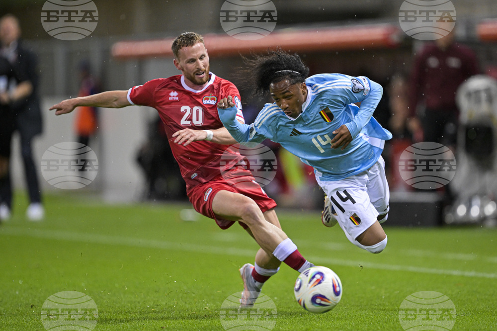 Liechtenstein's Sandro Wolfinger, left, tackles Belgium's Malick Fofana during World Cup qualifying Group J soccer match between Liechtenstein and Belgium, Thursday, Sept. 4, 2025, at the Rheinpark stadium in Vaduz, Liechtenstein. (Gian Ehrenzeller/Keystone via AP)