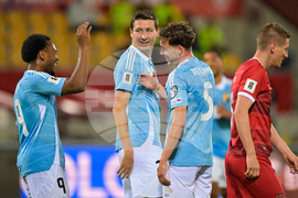 Belgium's Arthur Theate celebrates scoring during the World Cup 2026 qualifying Group J soccer match between Liechtenstein and Belgium at the Rheinpark stadium, in Vaduz, Liechtenstein, Thursday, Sept. 4, 2025. (Gian Ehrenzeller/Keystone via AP)