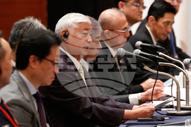 Japanese Foreign Minister Takeshi Iwaya, fourth left, and Defense Minister Gen Nakatani, third left, meet with Australian Foreign Minister Penny Wong, sixth right, and Defense Minister Richard Marles, fifth right, in Tokyo Friday, Sept. 5, 2025. (Rodrigo Reyes Marin/Pool Photo via AP)