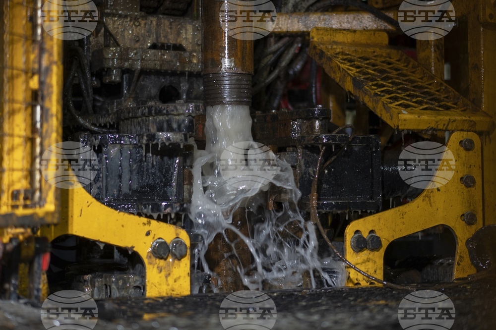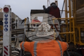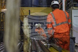 Expedition 501 drilling team members, from left, Nick Boehne, Chris Redding and Lalo Aguilar work to remove a core sample from an inner tube during a wireline core drilling operation aboard the Liftboat Robert platform, in the North Atlantic, Sunday, July 20, 2025. (AP Photo/Carolyn Kaster)
