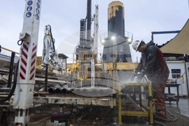 Drilling team member Lalo Aguilar works on inner tubes during an Expedition 501 wireline core drilling operation aboard the Liftboat Robert platform, in the North Atlantic, Sunday, July 20, 2025. (AP Photo/Carolyn Kaster)