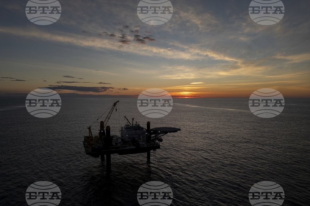 The sun sets behind the Liftboat Robert platform, home of Expedition 501, in the North Atlantic, Saturday, July 19, 2025. (AP Photo/Carolyn Kaster)