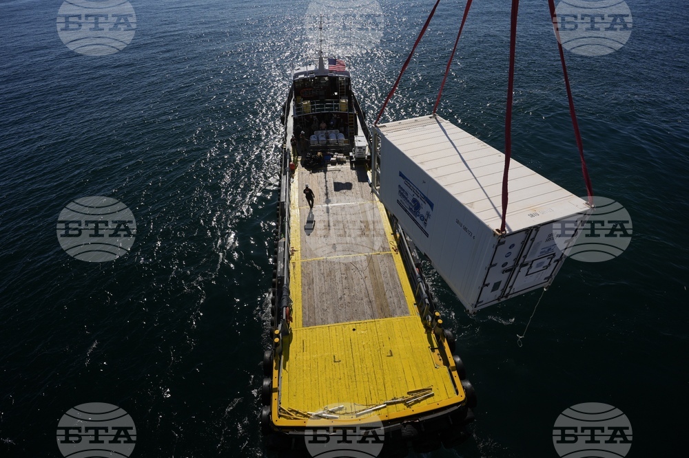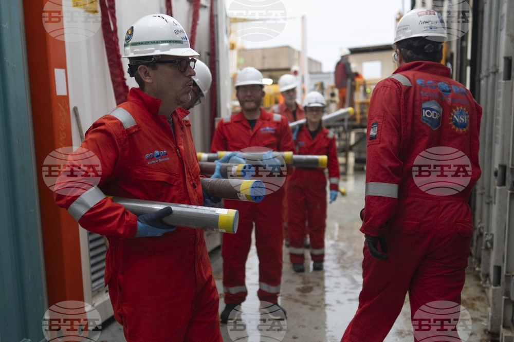 Expedition 501 researchers, including Brandon Dugan, Expedition 501 co-chief scientist, carry cores to a cold storage container aboard the Liftboat Robert platform, in the North Atlantic, Sunday, July 20, 2025. (AP Photo/Carolyn Kaster)
