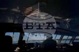 An American flag is reflected in the windows of the bridge as mate Peter Emery pilots the Gaspee, a crew transport vessel, along the Sakonnet River near Portsmouth, R.I., during the eight-hour trip to the Liftboat Robert platform and Expedition 501 in the North Atlantic, Saturday, July 19, 2025. (AP Photo/Carolyn Kaster)
