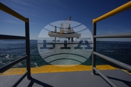 Expedition 501 members look down from the Liftboat Robert platform, to the approaching Gaspee, a crew transport vessel, in the North Atlantic, Saturday, July 19, 2025. (AP Photo/Carolyn Kaster)
