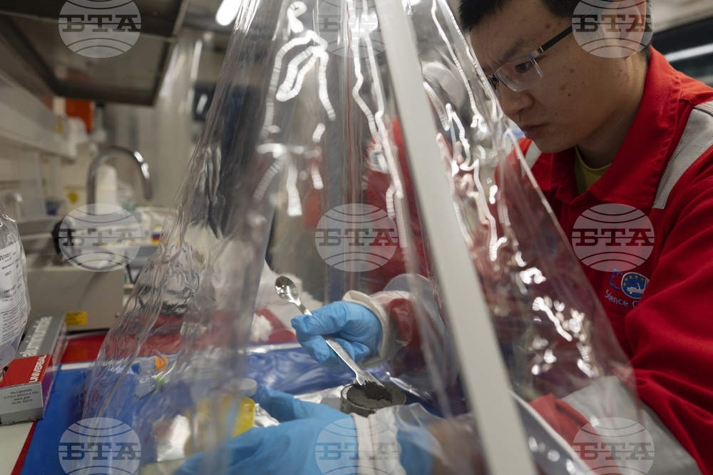 Expedition 501 researchers Xinxu Zhang, of Shenzhen University China, works in a container to ensure a sterile environment aboard the Liftboat Robert platform, in the North Atlantic, Sunday, July 20, 2025. (AP Photo/Carolyn Kaster)