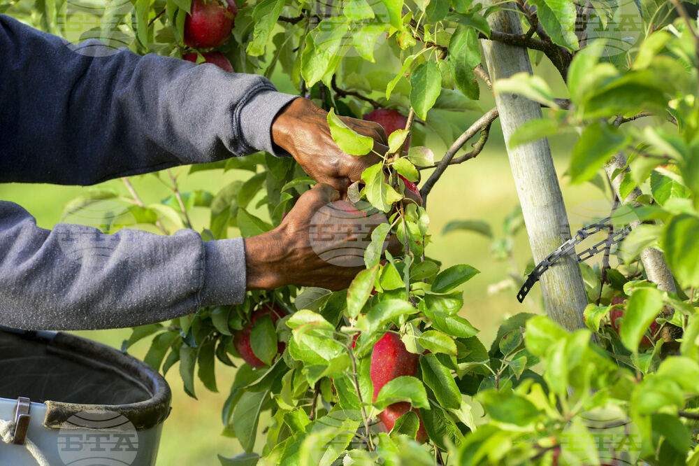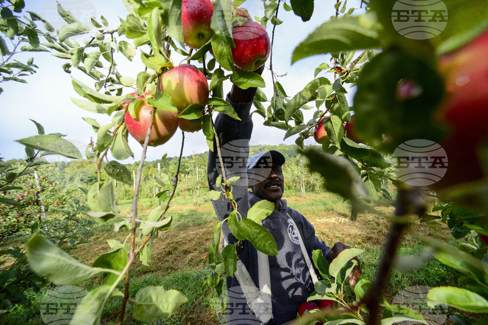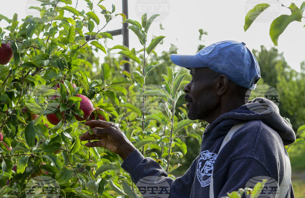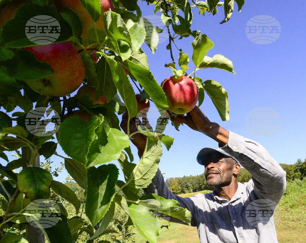 Fredson Brissett, a migrant worker from the island nation of Jamaica and crew leader at Scott Farm Orchard in Dummerston, Vt., harvests apples that were ready to be picked on Friday, Sept. 5, 2025. (Kristopher Radder/The Brattleboro Reformer via AP)