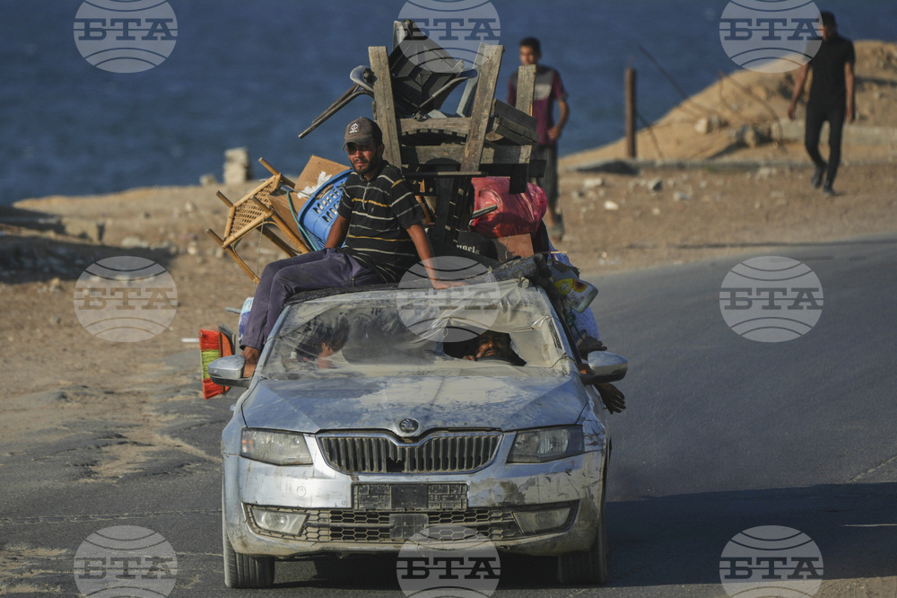 Displaced Palestinians fleeing northern Gaza carry their belongings in a car along the coastal road toward southern Gaza, Friday, Sept. 5, 2025. (AP Photo/Jehad Alshrafi)